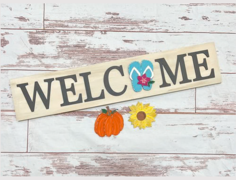 This listing is for the 3' Horizontal Welcome project and includes your choice of 2 icons. Please select if you'd like to come to the event in store at 6:00pm on October 23rd or if you would like to order a Take + Make Kit to complete at home! Note this project is not available for shipping at this time.